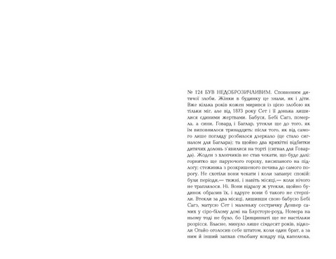 Сет народилася рабинею та втекла до вільного штату Огайо, але й вісімнадцять років по тому не почувається вільною. Вона пережила немислиме й не збожеволіла, проте досі перебуває в полоні спогадів про «Милий Дім», прекрасну кентуккську плантацію, де сталося стільки жахливих речей. У будинку № 124, де зараз мешкає Сет із донькою Денвер, переплелися минуле й сьогодення, реальне та містичне, думки й почуття колишніх і теперішніх пожильців. Жінку переслідує привид її дитини, яка померла безіменною і на надгробку якої викарбувано єдине слово: «Кохана».