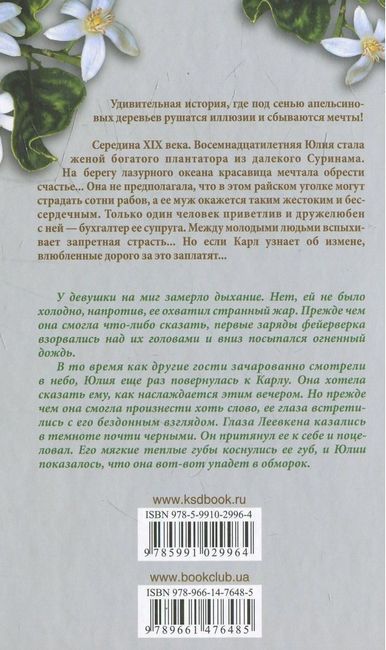 Сирота Юлия должна стать женой немолодого плантатора или уйти в монастырь. Так девушка оказывается в далеком Суринаме. Юлия не предполагала, что в краю апельсиновых рощ и ярких орхидей могут страдать сотни рабов. Ее муж жесток и беспощаден. А вот его бухгалтер окружил юную хозяйку вниманием и заботой. В сердце Юлии впервые расцвела любовь. Но если Карл узнает об измене, влюбленным придется дорого заплатить за минуты блаженства. Чтобы сохранить любовь, Юлия совершает страшный грех…