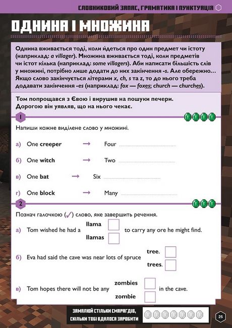 Ваша дитина вирушить у кілька пригод дивовижним світом Minecraft, вдосконалюючи знання англійської мови в процесі. Вирушайте у пригоду світом Minecraft завдяки посібнику! Ігрові персонажі, Том і Єва, які зустрінуться читачеві на сторінках посібника, виконують непрості місії і відважно шукають скарби... повсякчас відбиваючись від надокучливих мобів!