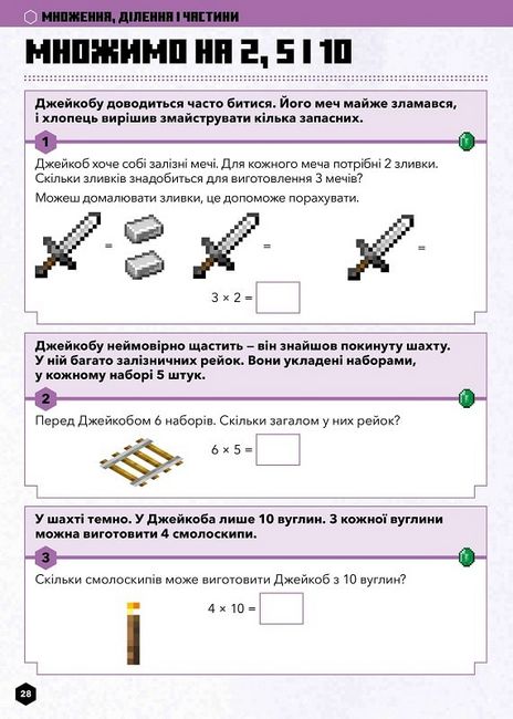 • Дитина в ігровій формі розв’язуватиме тематичні задачі та за кожну відповідь зароблятиме певну кількість смарагдів. Згодом їх можна буде «обміняти» на останній сторінці.