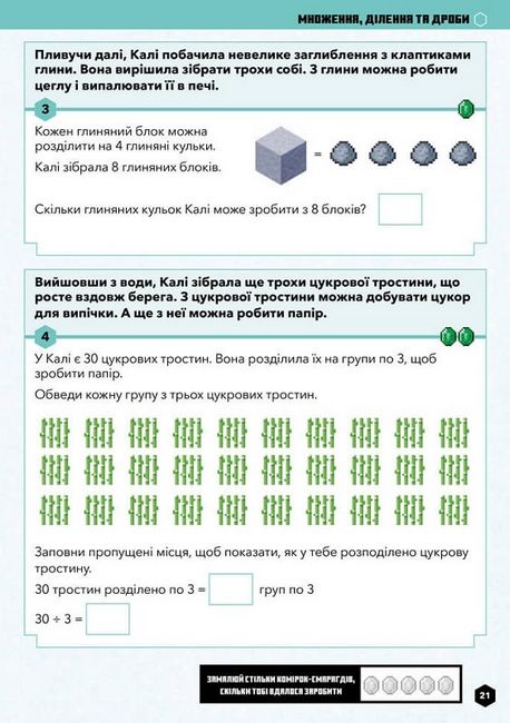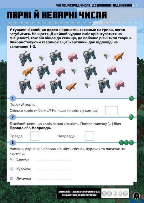 • Дитина в ігровій формі розв’язуватиме тематичні задачі та за кожну відповідь зароблятиме певну кількість смарагдів. Згодом їх можна буде «обміняти» на останній сторінці.
