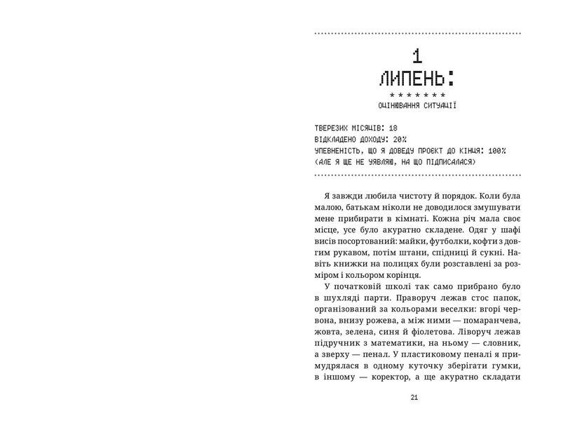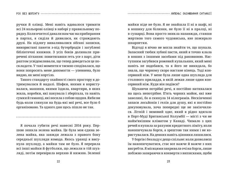 Легка, життєва та водночас глибока історія про надмірне споживання. Згубна звичка скуповувати все, токсичні стосунки, алкоголь, легкі наркотики та кредити — у цій книзі поєдналось абсолютно все, що “допомагає” нам заповнити внутрішню порожнечу. Та чи дійсно це працює? Авторка видання Кейт Фландерс допоможе вам зануритись у справжню сутність речей та на власному досвіді розкаже, яким може бути життя без шопінгу.