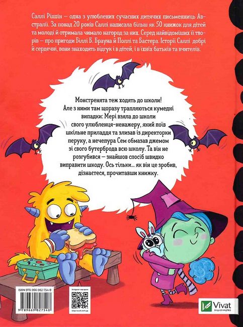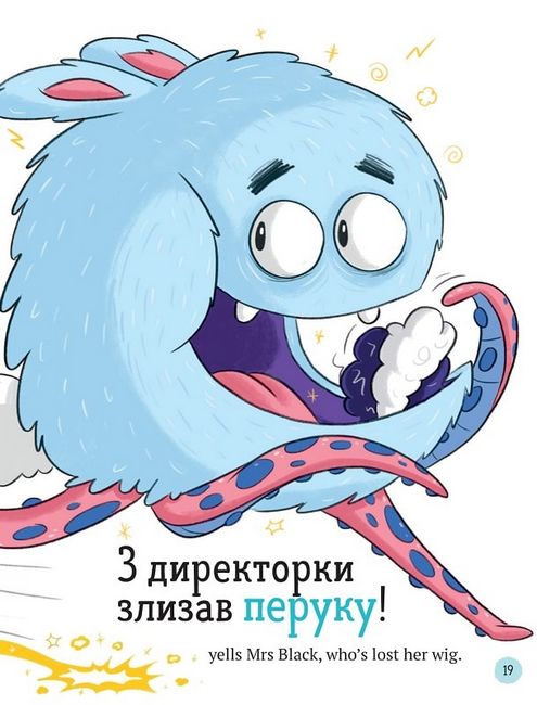 Монстренята теж ходять до школи! Але з ними там щоразу трапляються кумедні випадки: Мері взяла до школи свого улюбленця-ненажеру, який поїв шкільне приладдя та злизав із директорки перуку, а нечепура Сем обмазав джемом зі свого бутерброда всю школу. Та він не розгубився — знайшов спосіб швидко виправити шкоду. Ось тільки... як він це зробив, дізнаєтеся, прочитавши книжку.
