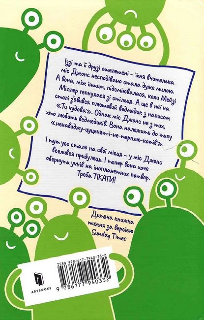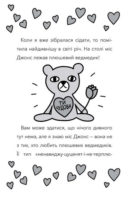 Іззі та її друзі ошелешені — їхня вчителька міс Джонс несподівано стала дуже милою. А вона, між іншим, підсміювалася, коли Мейзі Міллер недавно гепнулася зі стільця. А ще у неї на столі з’явився плюшевий ведмедик з написом «Ти чудова!». Однак міс Джонс не з тих, хто любить ведмедиків. Її радше можна віднести до жінок типу «ненавиджу-цуценят-і- не-терплю-котів».