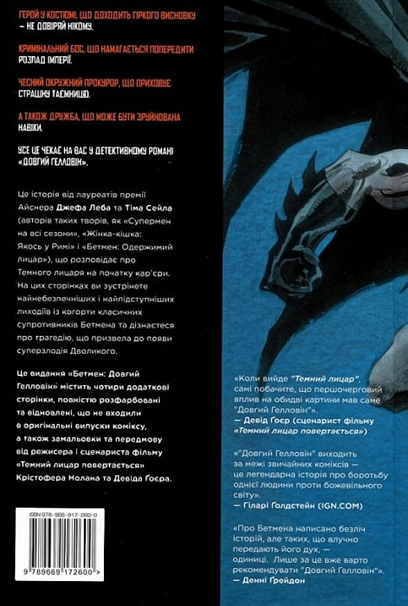 Герой у костюмі, що доходить гіркого висновку — не довіряй нікому. Кримінальний бос, що намагається попередити розпад імперії. Чесний окружний прокурор, що приховує страшну таємницю. А також дружба, що може бути зруйнована навіки.Усе це чекає на вас у детективному романі «Довгий Гелловін».