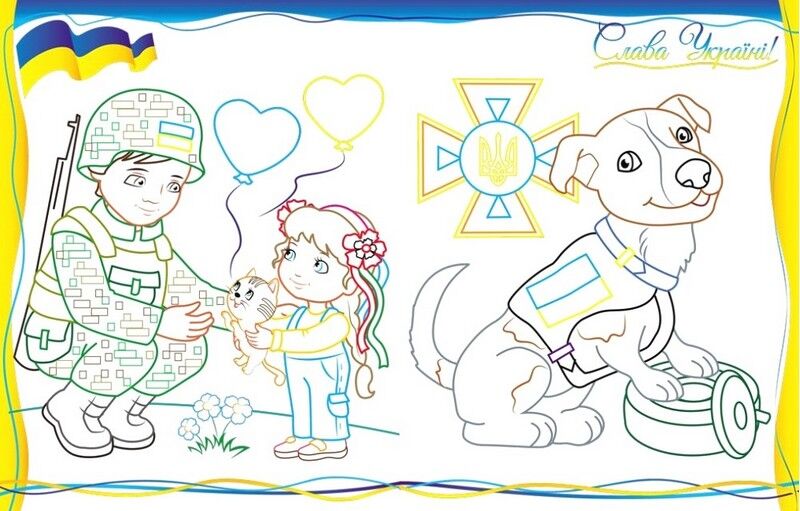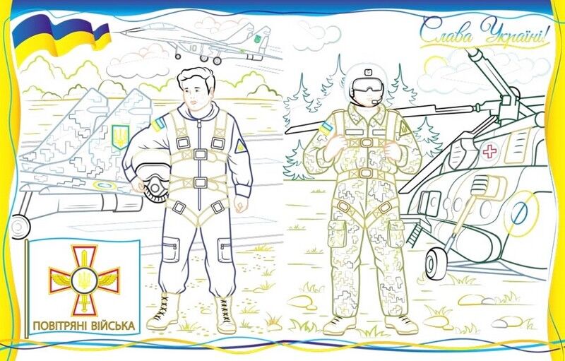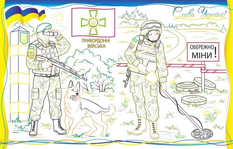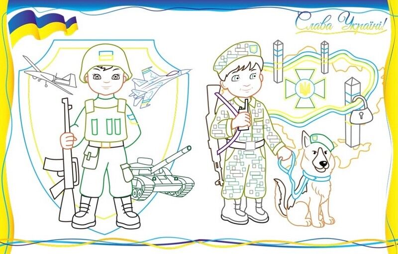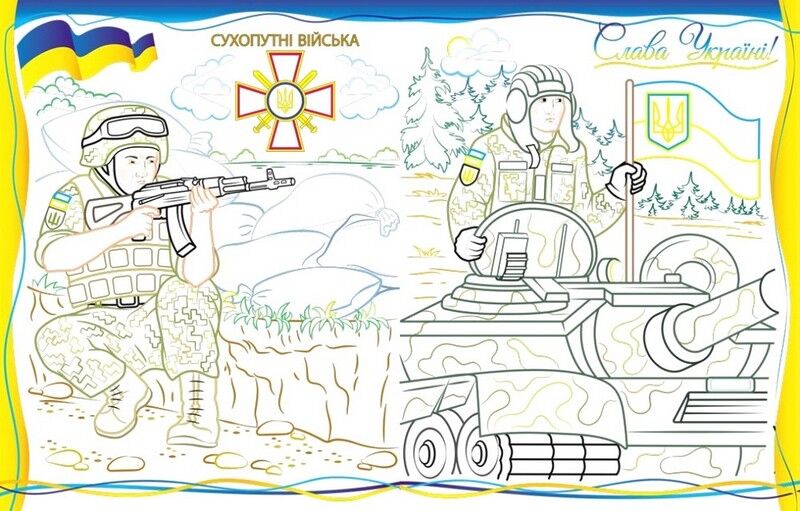 Збірка розмальовок з кольоровими контурами. Розмальовки присвячені нашим славетним захисникам, бійцям Збройних Сил України.