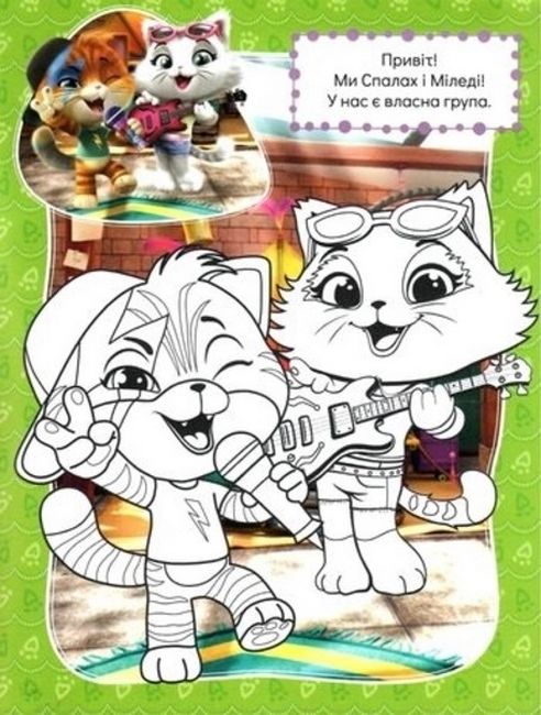 В книге 16 страниц с цветными и черно-белыми рисунками, которые можно раскрасить в соответствии с образцом. Под картинками есть надпись, которая рассказывает о героях мультфильма "44 Cats".