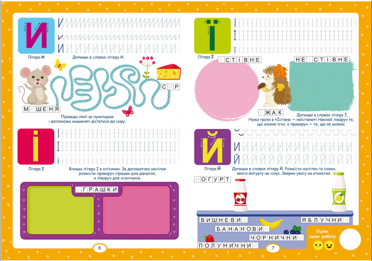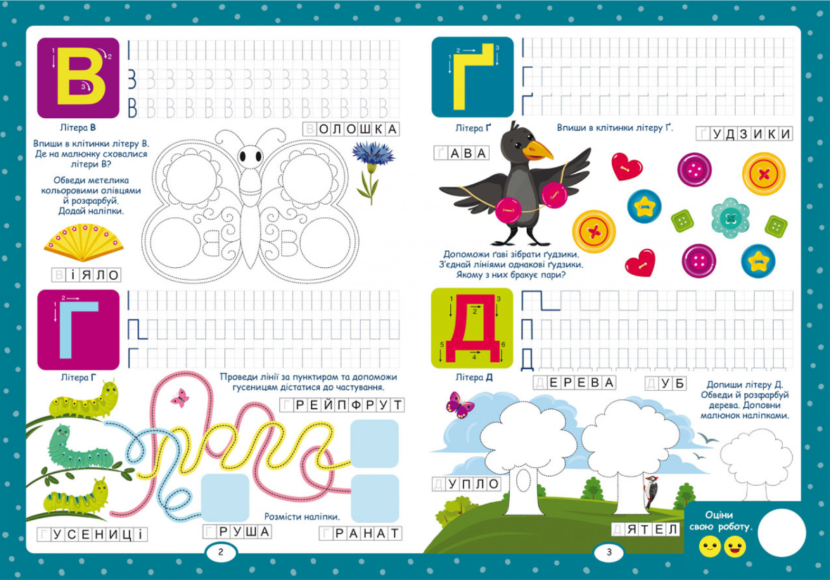 Запропоновані нами завдання більше нагадують ігри, що так подобаються маленьким хлопчикам і дівчаткам.Тому виконувати їх буде зовсім не нудно. До того ж ми постаралися урізноманітнити вправи, щоб діти могли не тільки малювати та приклеювати картинки, а й обводити графічні елементи, удосконалюючи каліграфію, а також рахувати, запам’ятовувати літери та складати з них слова.