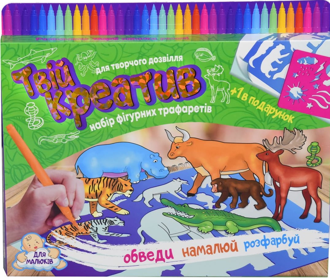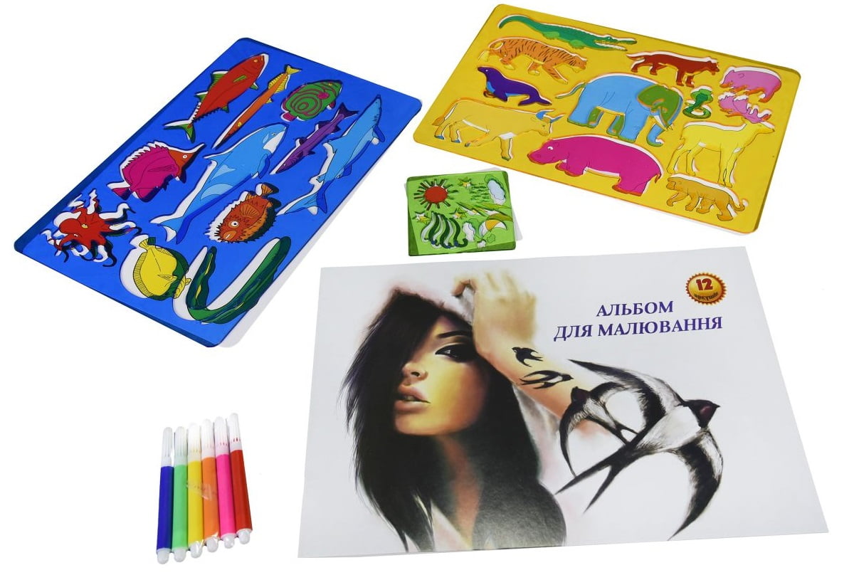 За допомогою набору маленький художник зможе намалювати улюблених звірів або придумати нових. У наборі є все необхідне - альбом, набір різнокольорових фломастерів та трафарети з веселими звірятами та рибками. Додатковий бонус - трафаретка із зображенням сонця, місяця і символів погодних умов. Використовувати їх дуже легко - досить прикласти до аркушу паперу і обвести олівцем, а потім творчо підійти до розфарбовування отриманого контуру. Компонуючи різні трафарети можна створювати великі художні композиції і цікаві картинки.