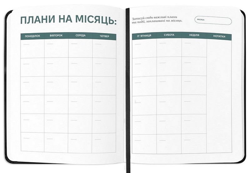 - містять додаткові круті розвороти: плани на місяць, цілі на пів року, колесо балансу, трекер звичок, список улюблених фільмів, книг, подкастів, курсів, нотатки.