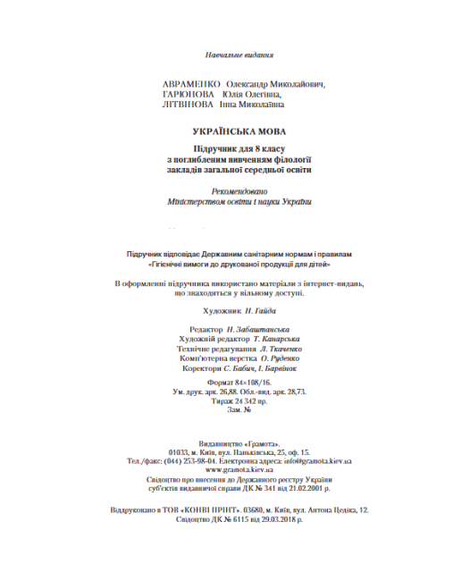 Підручник Українська мова 8 клас з поглибленим вивченням філології Програма 2021 Авт: Авраменко О. Вид-во: Грамота 73458