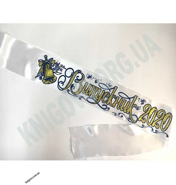 Атласна стрічка Випускник 2020 Білого кольору Золотисто-синій напис. Малюнок дзвоник. Мова українська. Кріпиться булавкою.