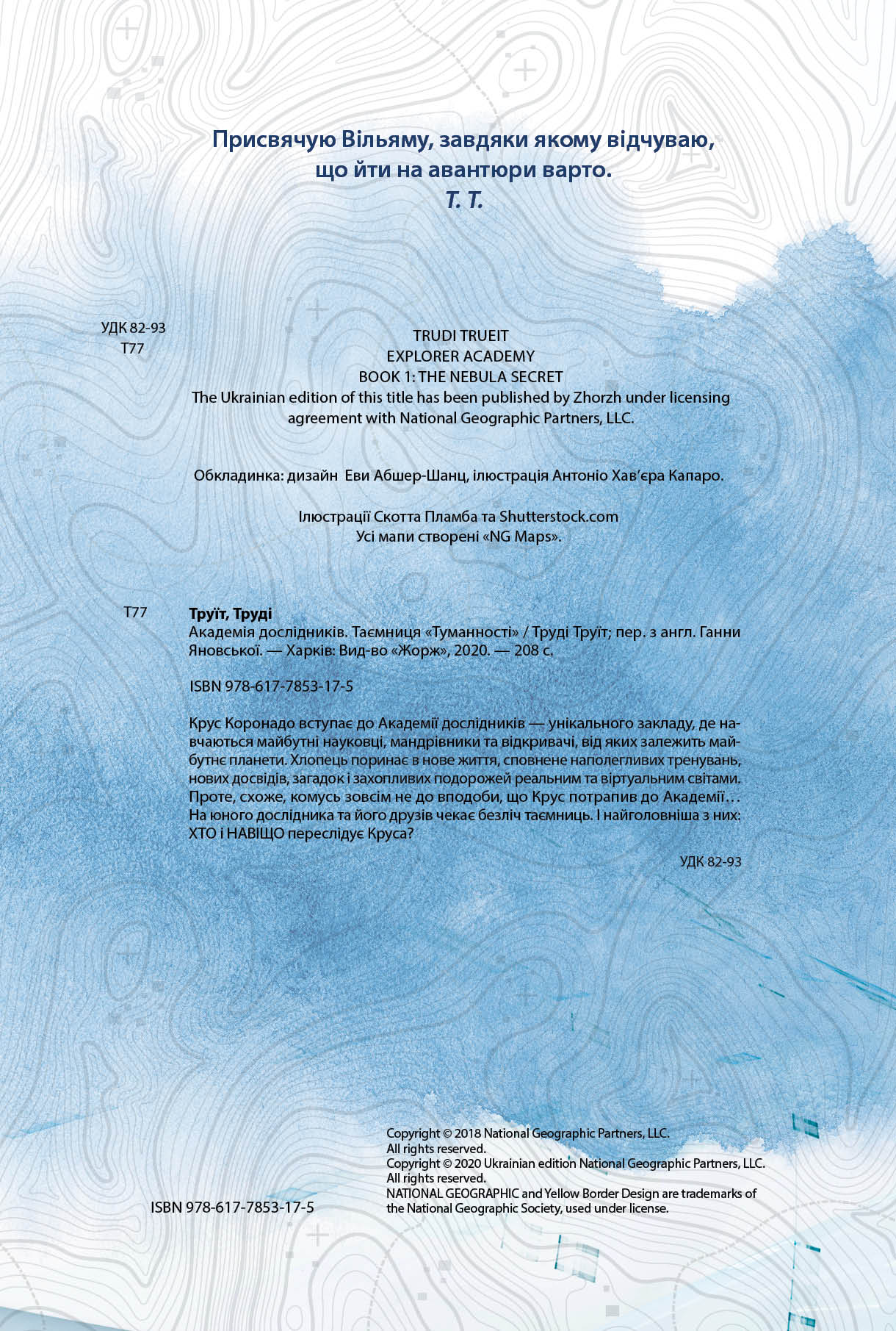 Академія дослідників Таємниця Туманності Час із книгою Труді Труїт Ранок. Небезпечні пригоди, висока мета й надзвичайна місія чекають на 12-річного Круса Коронадо. Разом із 23 однокласниками він вирушить у навколосвітню подорож, в ході якої найкращі викладачі готують нове покоління видатних дослідників світу. Щойно прибувши до Академії, він виявляє: минуле його сім’ї пов’язане з таємничою організацією, яка може загрожувати його майбутньому. За ліцензією National Geographic.