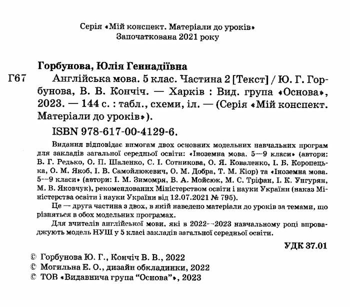 Мій конспект Англійська мова 5 клас Частина 2 НУШ Авт: Ю. Г. Горбунова В. В. Кончіч Вид-во: Основа 85727