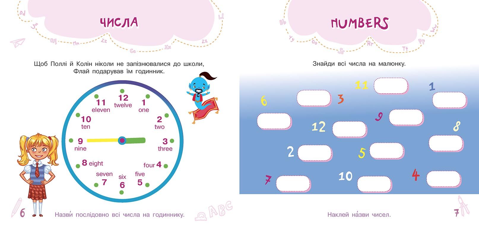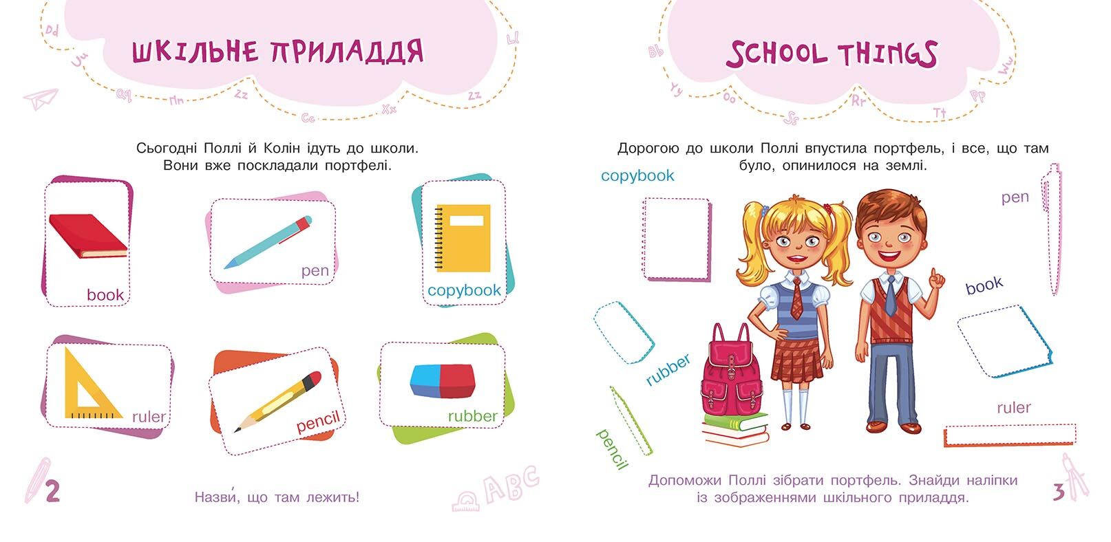У цій книзі діти знайомляться з різноманітними об'єктами та предметами, що зустрічаються у шкільному середовищі, такими як предмети учбової зони, спортивний інвентар, різноманітні предмети учбового призначення тощо. Кожна сторінка містить зображення та назву предметів як українською, так і англійською мовами.