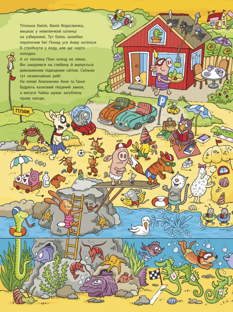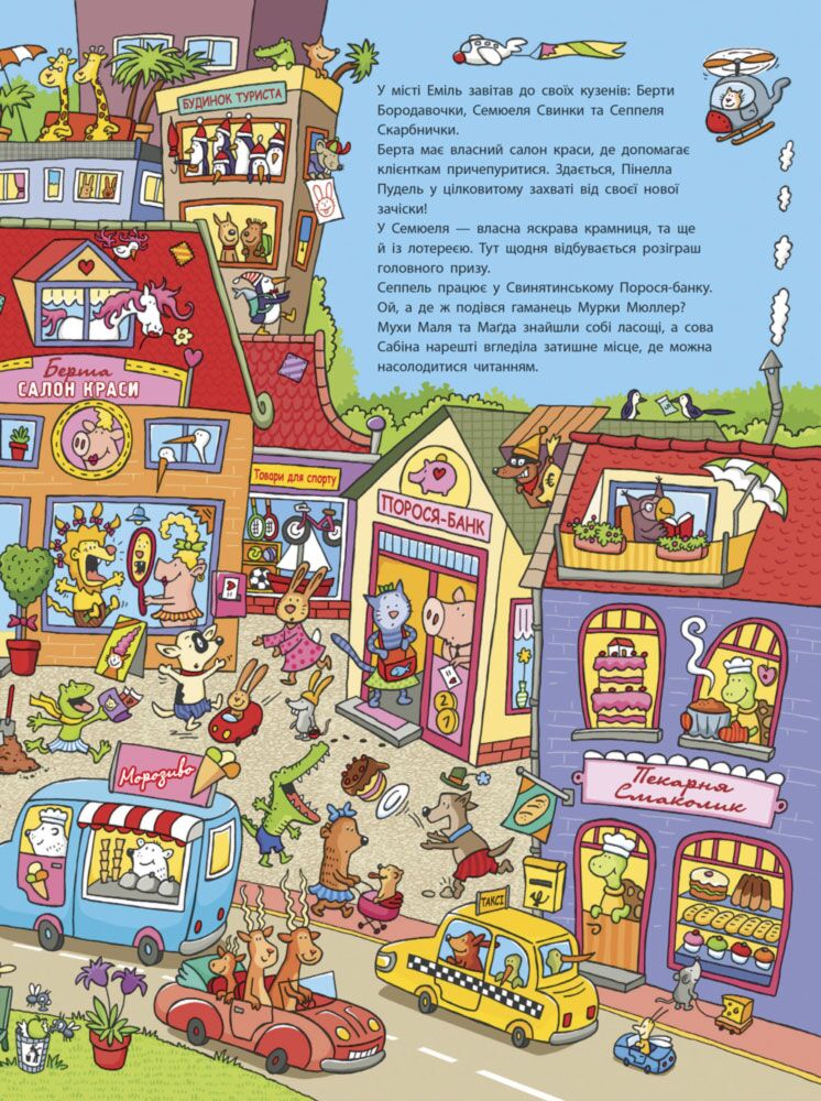 Сторінки цього вімельбуха ховають справжнісіську історію-пригоду Еміля з родини Поросяток. Він має рознести запрошення на новосілля, та не просто рознести, а дістатися кожного гостя і запросити особисто. Смішні та веселі персонажі, пригодницька історія та деталізовані малюнки із цієї книжки не залишать байдужим жодного малюка.