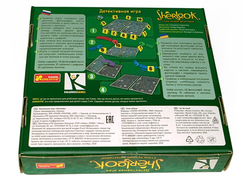 Детективная игра Sherlook Ранок. Авторська детективна гра «Шерлук» це гра, де можна проявити свої дедуктивні здібності, пильність та логічне мислення, шукаючи докази злочину! Проведіть 10 розслідувань і станьте найкращим детективом! Мета гри: помітити всі відмінності на двох фотографіях. Переможцем стає той, хто знайшов їх найбільше! Правила гри дуже прості, тому грати в «Шерлук» буде цікаво як дорослим так і дітям! Гра ідеальна для вечірок, домашніх та дружніх посиденьок