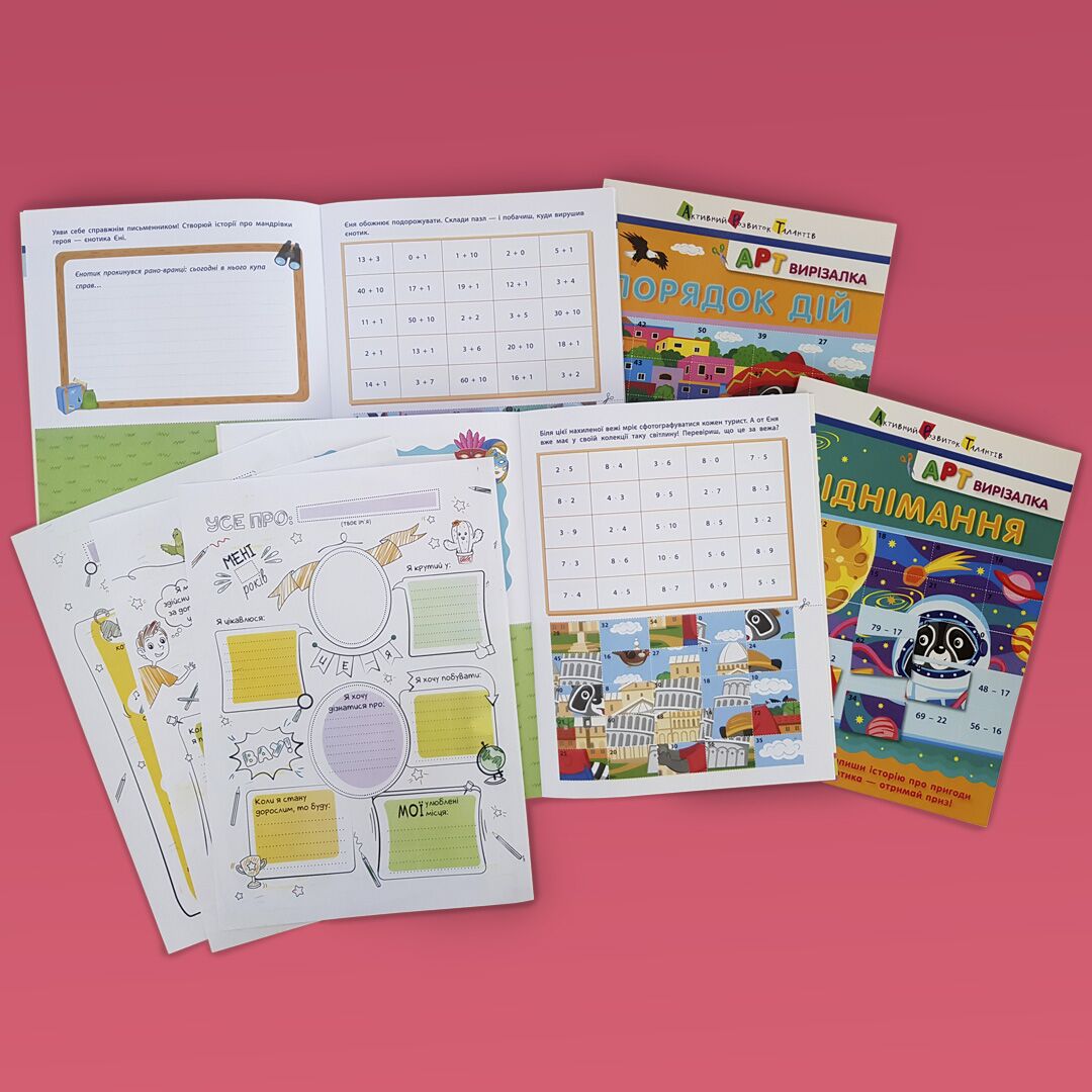 Комплект математичних зошитів-пазлів. Зошити містять звичні та улюблені для дітей заняття: вирізання та складання пазлів. Адже вивчати нове набагато простіше через щось знайоме. Звична справа залучає та допомагаю уникнути стресу. Щоб скласти пазл, дитині потрібно обчислити вираз, знайти елемент картинки з відповіддю, вирізати його та наклеїти на приклад. Завдяки такому підходу дитина закріплює вміння вирізати, тренує координацію рухів, практикує навички обчислення, розвиває увагу та логічне мислення.