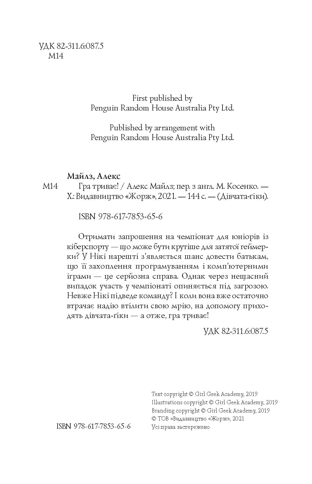 Отримати запрошення на чемпіонат для юніорів із кіберспорту — що може бути крутіше для затятої геймерки? У Нікі нарешті з’являється шанс довести батькам, що її захоплення програмуванням і комп’ютерними іграми — це серйозна справа. Однак через нещасний випадок участь у чемпіонаті опиняється під загрозою. Невже Нікі підведе команду? І коли вона вже остаточно втрачає надію втілити свою мрію, на допомогу приходять дівчата-ґіки — а отже, гра триває!