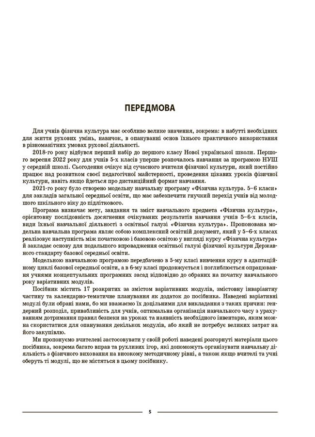 Посібник містить 17 розкритих за змістом варіативних модулів, змістовну інваріантну частину та календарно-тематичне планування як додаток до посібника. Наведені розгорнуті матеріали, зокрема багато вправ та рухливих ігор, допоможуть організувати навчальну діяльність і за модулями, що не містяться в цьому посібнику.