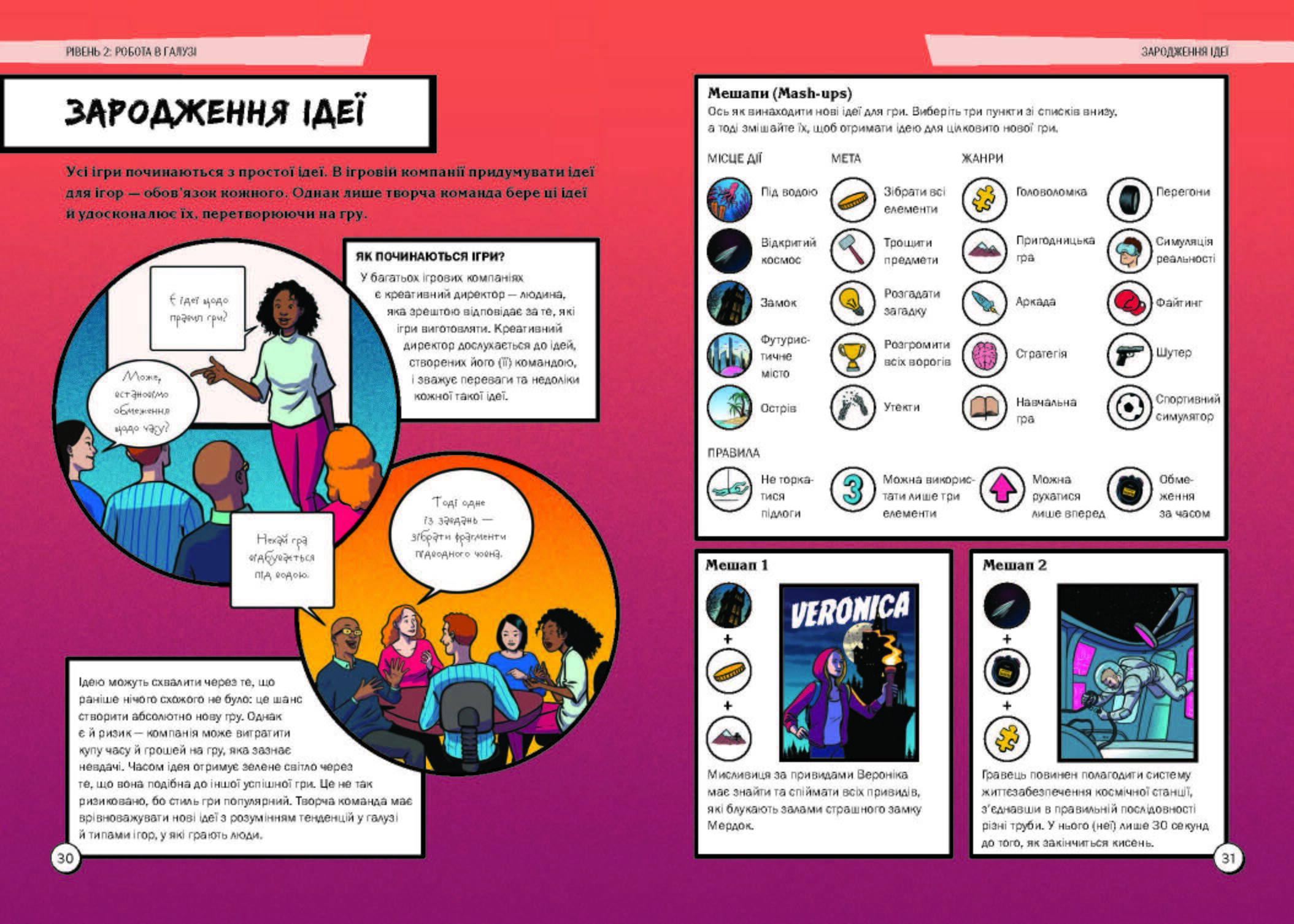 Ти непоганий геймер? Мислиш кодом? Чи може малюєш? Або спробував себе як стример? Переходь на новий рівень — знайди себе в індустрії ігор і стань профі! Узнай, які навички і знання потрібні для створення гри, які фахівці потрібні в ігровій галузі — від звукорежисерів і спеціалістів комп’ютерної графіки і до кодувальників і тестувальників. Дізнайся про ігрові жанри, обладнання, опануй мову професіоналів! Якщо маєш все потрібне — читай і переходь в режим кар’єри!