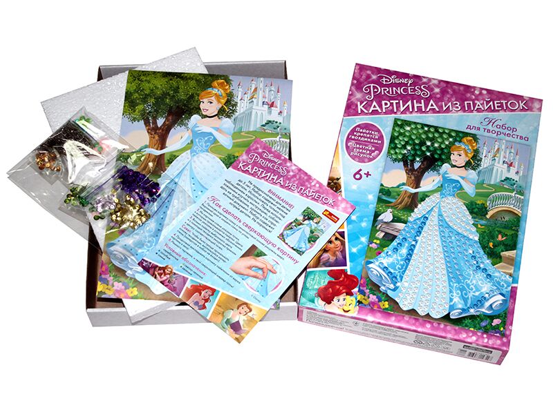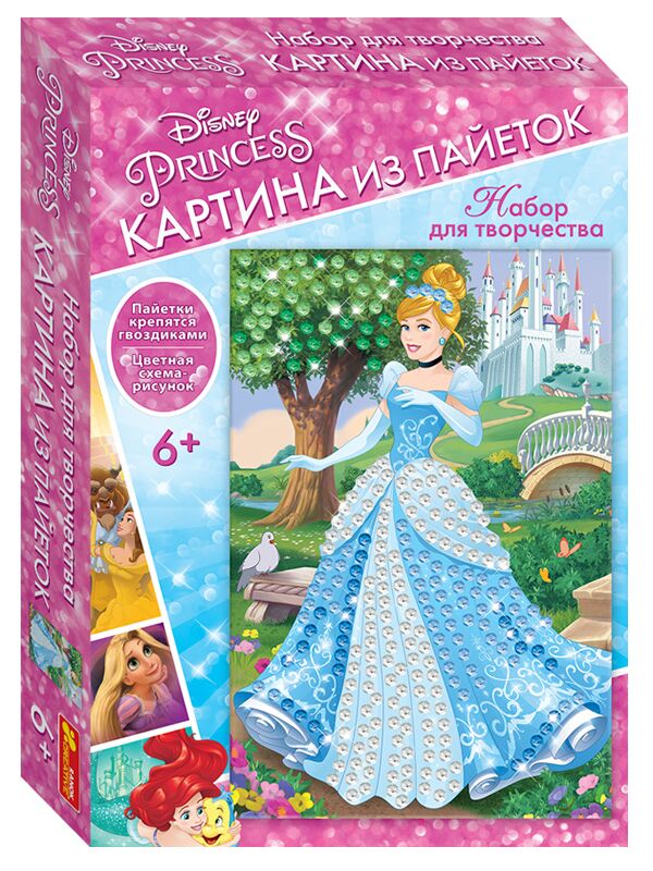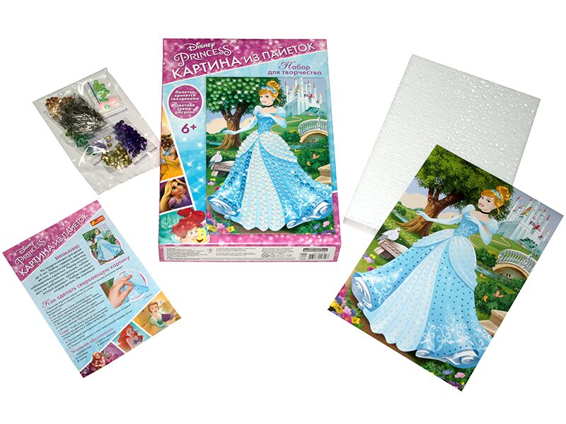 Формат: 33,6х23,7х5,1см.Зробити картинку з паєток дуже просто і захоплююче!Картина з паєток "Принцеса Попелюшка" займе на довгий час Вашу дитину.Набір містить все необхідні складові: кольорові паєтки,гвоздики, кольорова схема,пінопластова основа, інструкція.Необхідно тільки приколоти гвоздиками паєтки певного кольору на картину-основу. Ви будете здивовані результатами роботи,так як картина вийде просто дуже красивою і блискучою. Помилуйся,твоя картинка готова! Вона стане гарним подарунком для рідних та друзів!