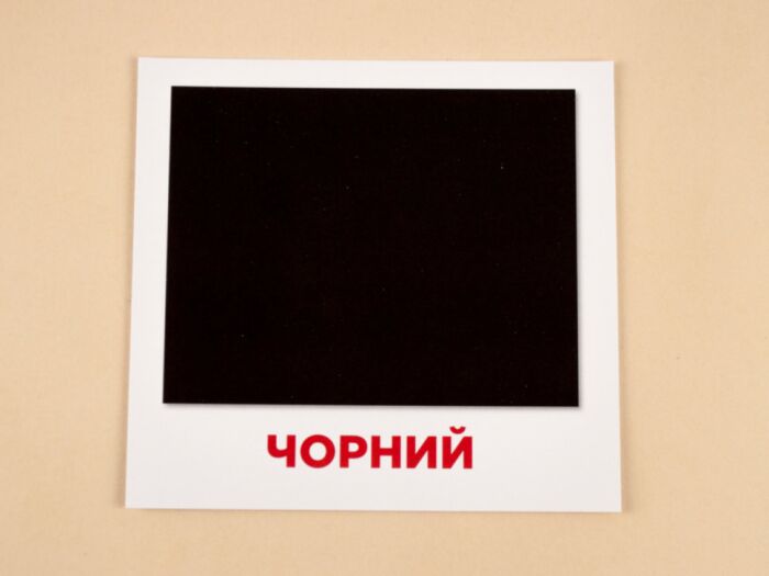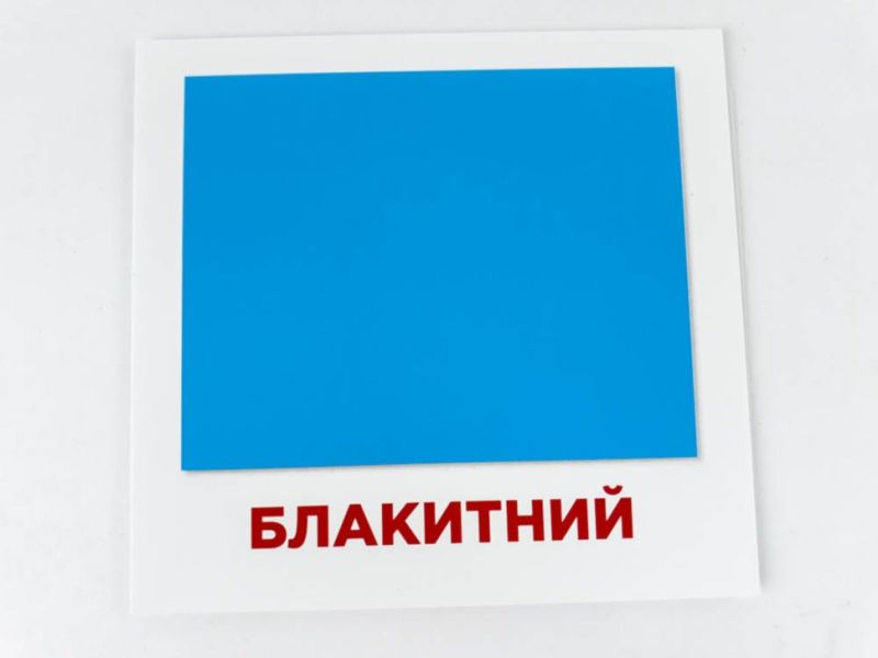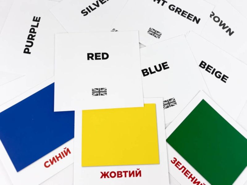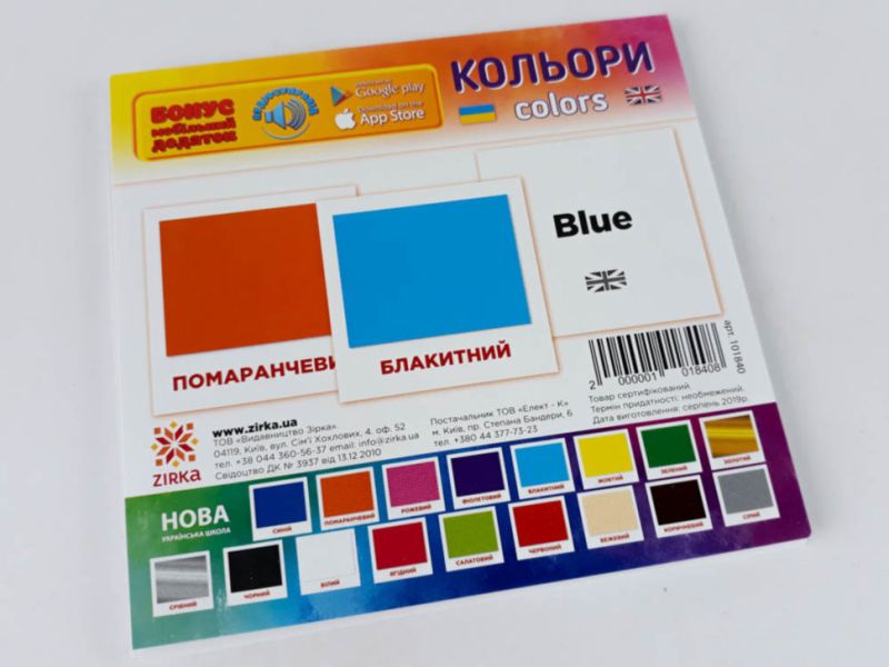 Кожна картка має розмір 110х110 мм і містить зображення різних предметів або позначень кольорів. Кожен колір супроводжується його назвою як українською, так і англійською мовами.