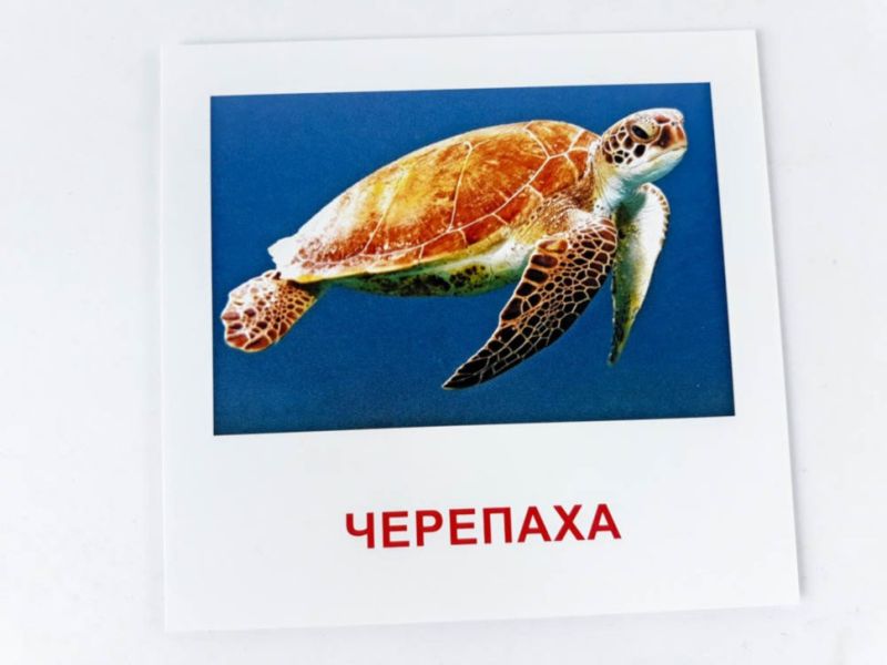 Кожна картка має розмір 110х110 мм і містить зображення різних морських істот, таких як риби, восьминоги, черепахи, морські коники та інші. Кожне зображення супроводжується назвою тварини як українською, так і англійською мовами.