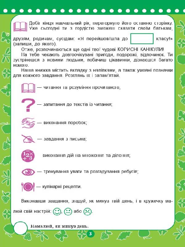 Посібник, складений за оновленими програмами для 2-го класу (редакція 2018 р.), призначений для виконання завдань протягом літніх канікул. Цікаві тексти для читання, завдання з лічби, тренування уваги, самоконтролю, майстрування, кулінарії допоможуть підтримати й розвинути не тільки загальнонавчальні навички, але й увагу, пам’ять, мислення дітей, допоможуть їм зустріти наступний навчальний рік, не втративши здобуті протягом попереднього навчального року знання. Новий спосіб запам’ятовування