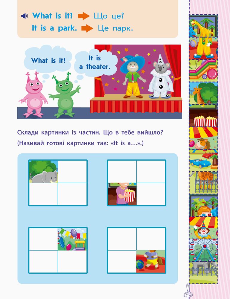 Із зошитами серії "Англійська до школи" вивчати англійську — суцільне задоволення! Дитина дізнаватиметься нові слова й фрази через гру, вирізання та наклеювання! Для зручності в кожному зошиті є словничок. А ще — аудіосупровід, доступний за QR-кодом.