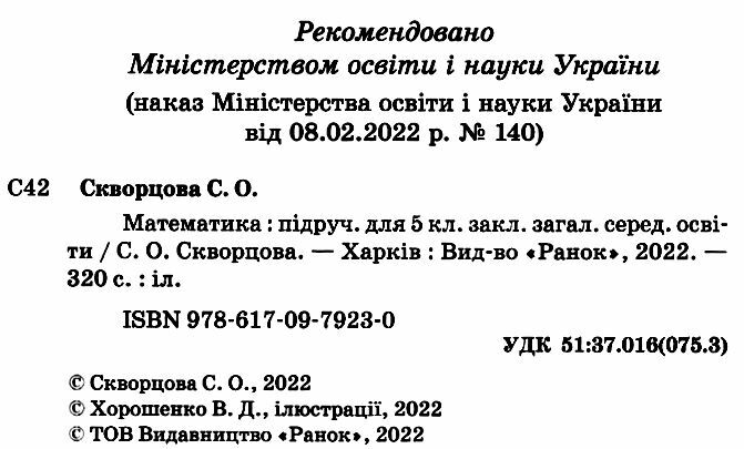 Підручник Математика 5 клас НУШ Авт: Скворцова С. О. Вид-во: Ранок 85535