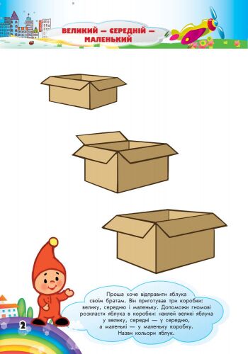 Видання допоможе дитині опанувати навички порівняння предметів, засвоїти по- няття «великий — маленький», «довгий — короткий», «темний — світлий» тощо. Завдання подані в ігровій формі. Видання сприяє розвитку логічного мислення, дрібної моторики рук, активного словникового запасу.