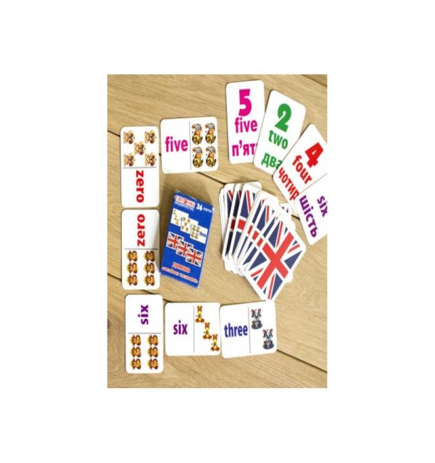 Пропонуємо вам цікаву гру — доміно, яка містить 36 карток - 28 фішок із малюнками, 7 карток з числівниками. Дитина в процесі гри ознайомиться з числівниками англійської мови (від 0 до 6). Грати буде легко й весело.