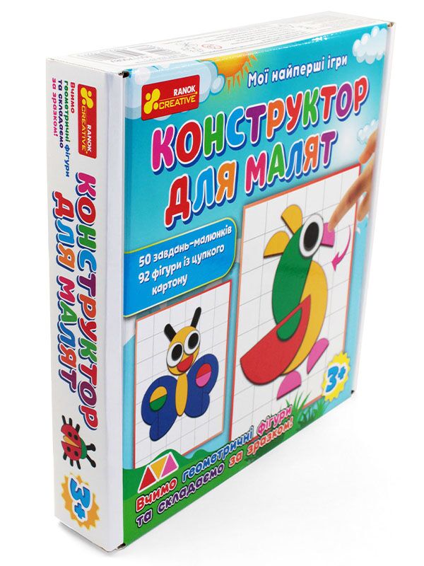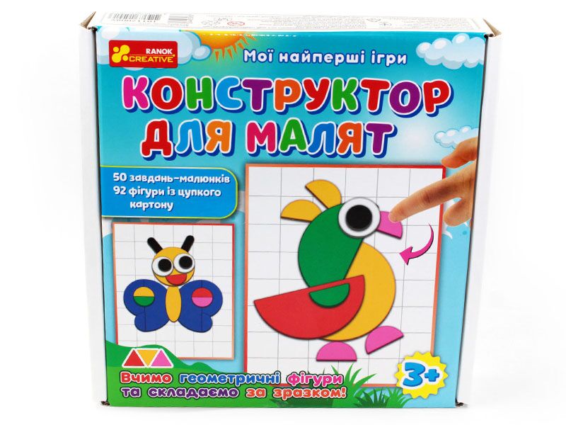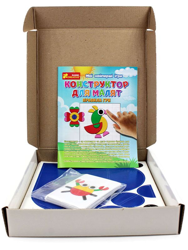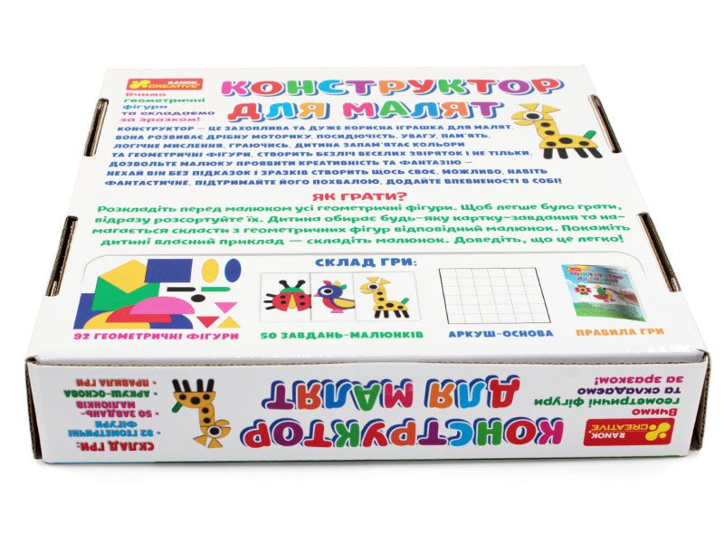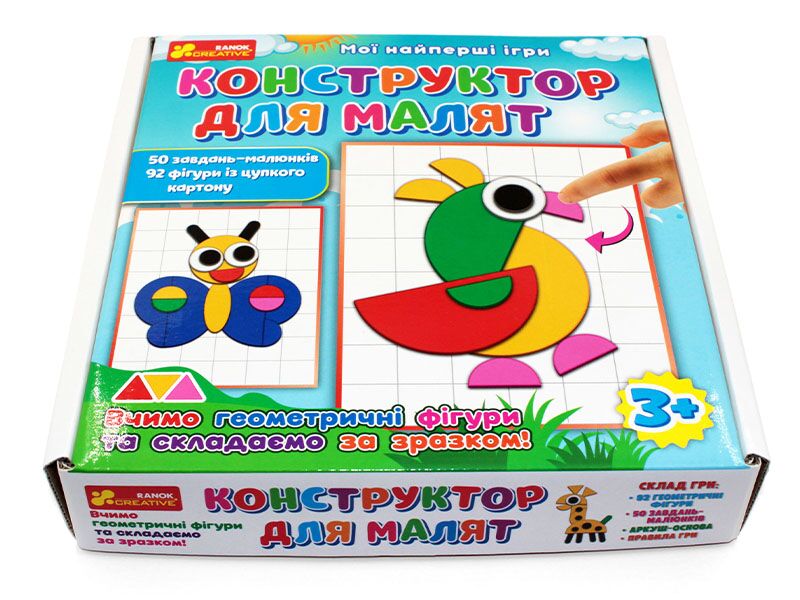 Формат:19,5х21,4х4см.Конструктор для малят-це цікава та дуже корисна іграшка! Вона розвиває дрібну моторику, посидючість, увагу, пам'ять, логічне мислення. Під час гри дитина запам'ятовує кольори та геометричні фігури. створює безліч кумедних звіряток за схемами і без них - фантазує й створює власних! Як грати з конструктором:малюк обирає будь-яку картку-завдання та складає з геометричних фігур відповідний малюнок. У наборі 50 завдань-малюнків,92 фігури із ціпкого картону, аркуш-основа, правила гри.