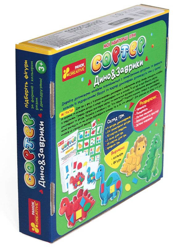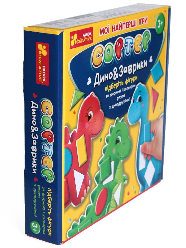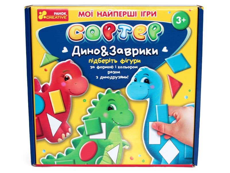 Формат:23х23х5см.Сортер "Дино&заврики" допоможе малюкам познайомитися з геометричними фігурами та вивчити кольори із задоволенням! Веселі та яскраві динозаврики допоможуть у нам цьому!Як грати:необхідно підібрати фігури за формою та кольором і викласти їх на динозаврика того ж кольору.Розглядаючи картку-завдання відтворюємо зображення,використовуючи динозаврика та фігури.Також з малечею можна пограти у гру "Хто перший" - роздаємо кожному гравцю по динозаврику,необхідно буде на швидкість викласти на них фігури відповідного кольору.