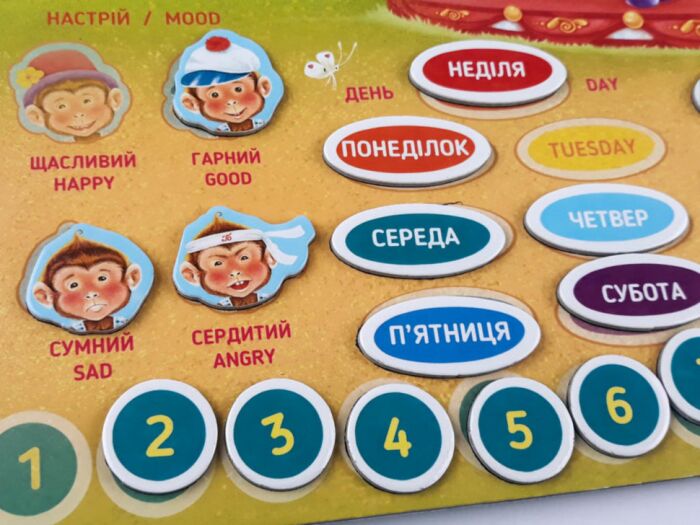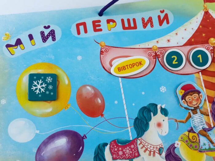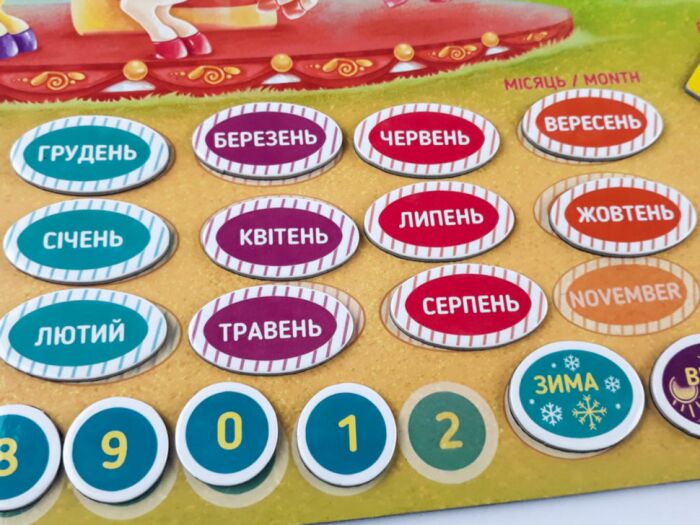 Мій перший календар – це цікава навчальна та пізнавальна гра з магнітними елементами українською та англійською мовами. Щоденно, граючи та заповнюючи календар, ваша дитина навчиться не тільки спостерігати за оточуючим її світом. Вона познайомиться з природними явищами та погодою, запам’ятає особливості пір року, назви місяців і днів тижня, а ще матиме можливість дізнатись ці назви англійською мовою. Крім того така гра дуже дисциплінує, вчить бути уважним та спостережливим, а також систематизує знання дитини. Розмір 420х297х3 мм.