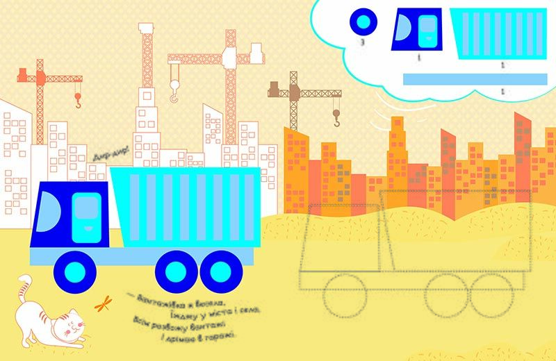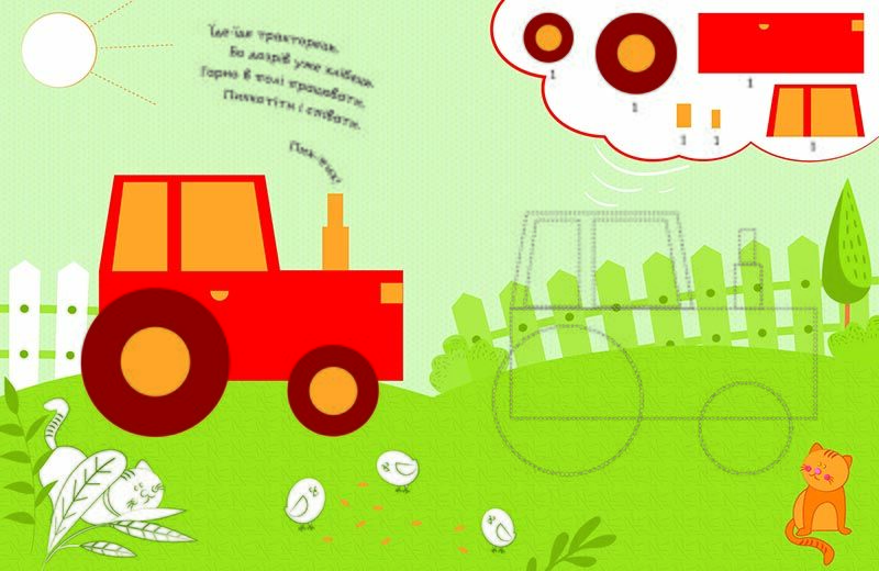 Справжній книжковий конструктор! Роздивляємося картинки, збираємо з наліпок об’єкти і читаємо віршики! Кожний об’єкт складається з кількох геометричних фігур.