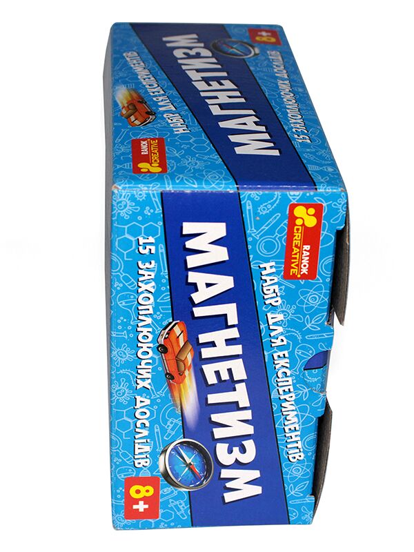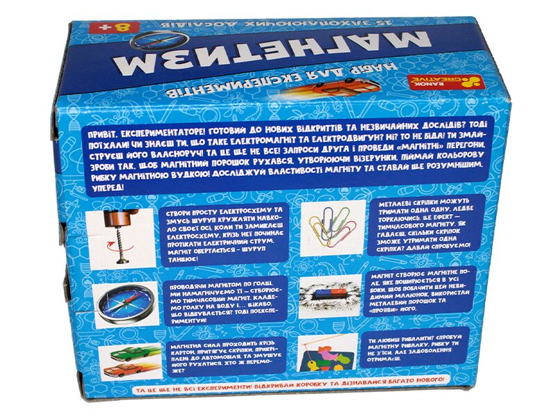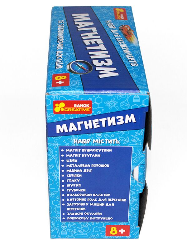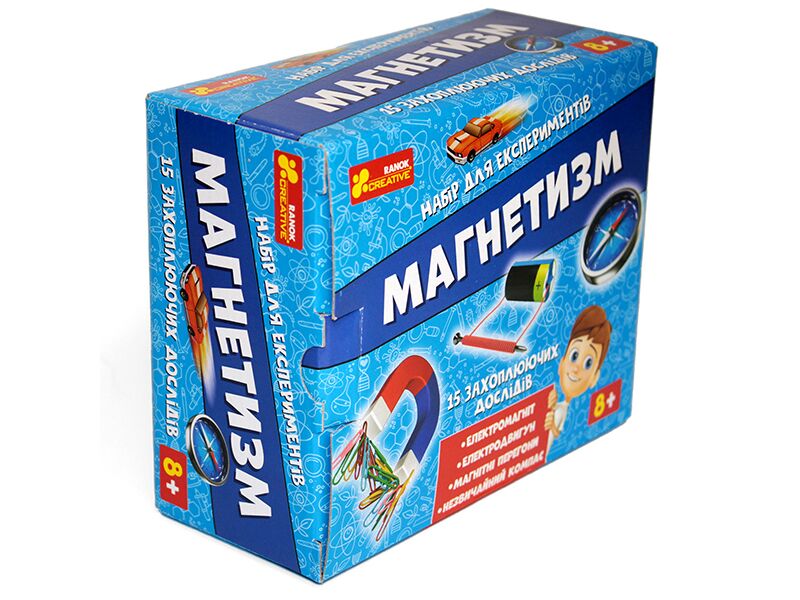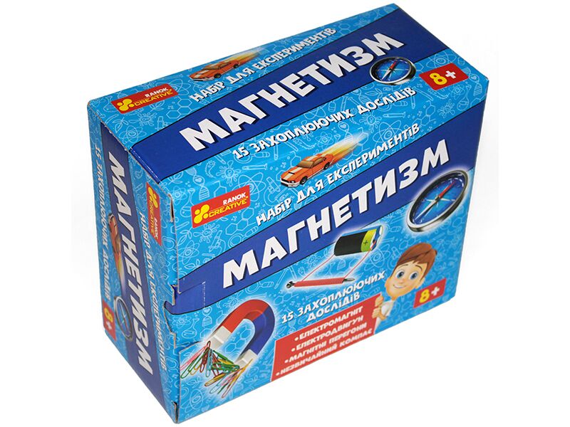 Формат: 18х15х8 см У цьому наборі 15 експериментів! Є все необхідні складові для проведення експериментів. Відкриваємо набір «Магнетизм» та розпочинаємо експериментувати! Ваша дитина може самостійно зробити електромагніт, "електродвигун" і компас, перевірити силу різних магнітів, а ще влаштувати веселі ігри з магнітами.