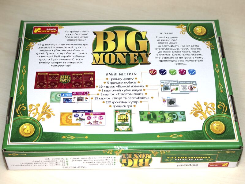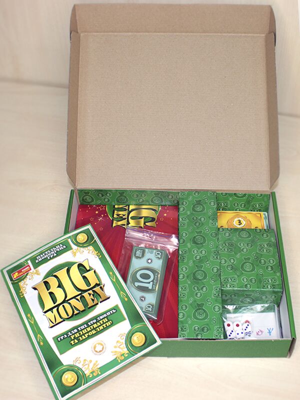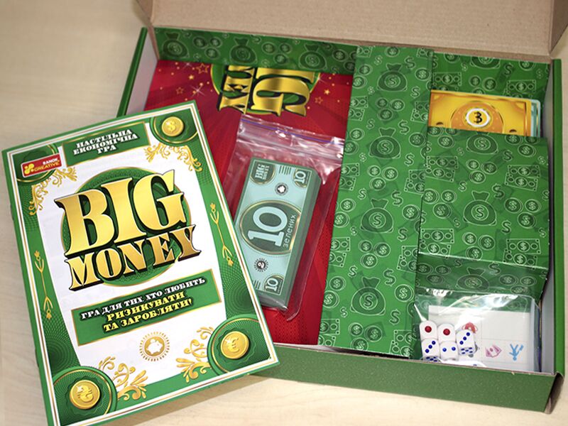 Настільна економічна гра Big Maney Ранок. Це економічна гра для всієї родини, в якій, просто кидаючи кубик, ви заробляєте гроші. Грати та заробляти — легко та весело! Щоб заробити більше, просто будь пильним. Створи власну імперію та знищи всіх конкурентів!