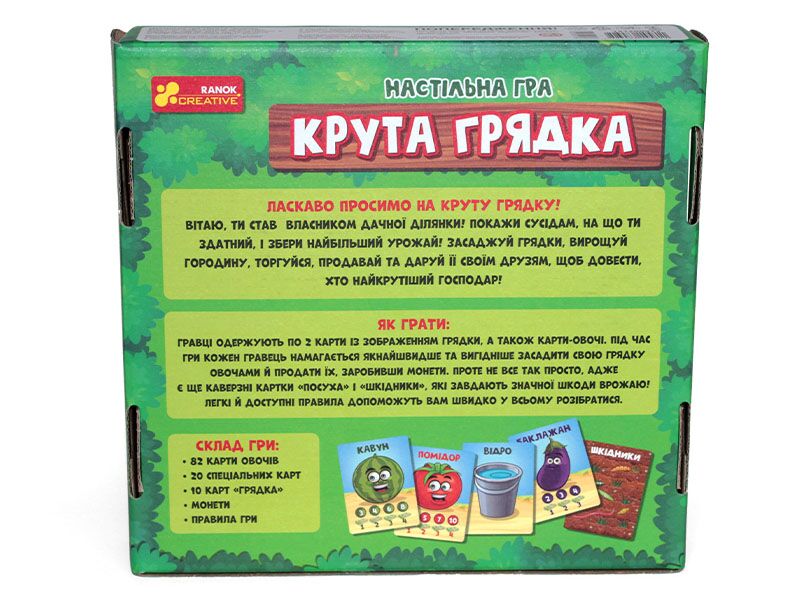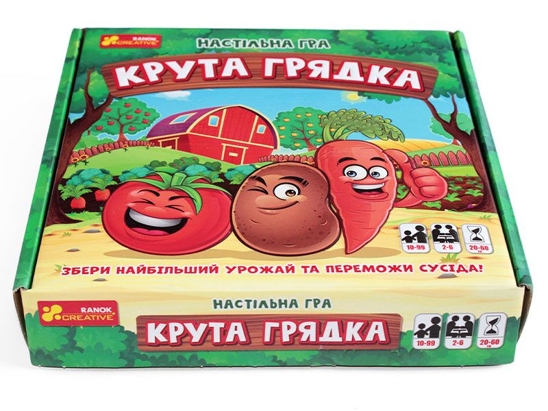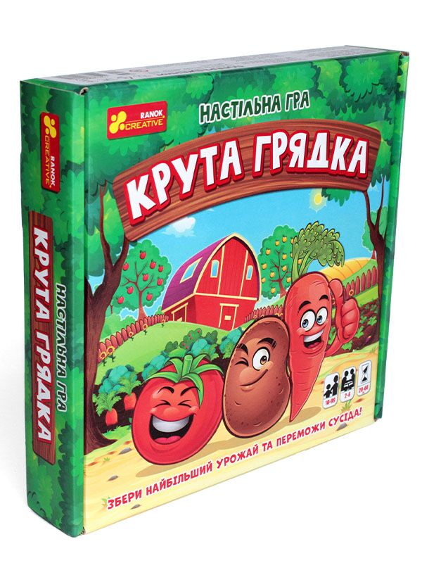 Настільна гра Крута грядка Ранок. Ласкаво просимо на круту грядку! Вітаю, ти став власником дачної ділянки! Покажи сусідам, на що ти здатний, і збери найбільший урожай! Засаджуй грядки, вирощуй городину, торгуйся, продавай та даруй її своїм друзям, щоб довести, хто найкрутіший господар!