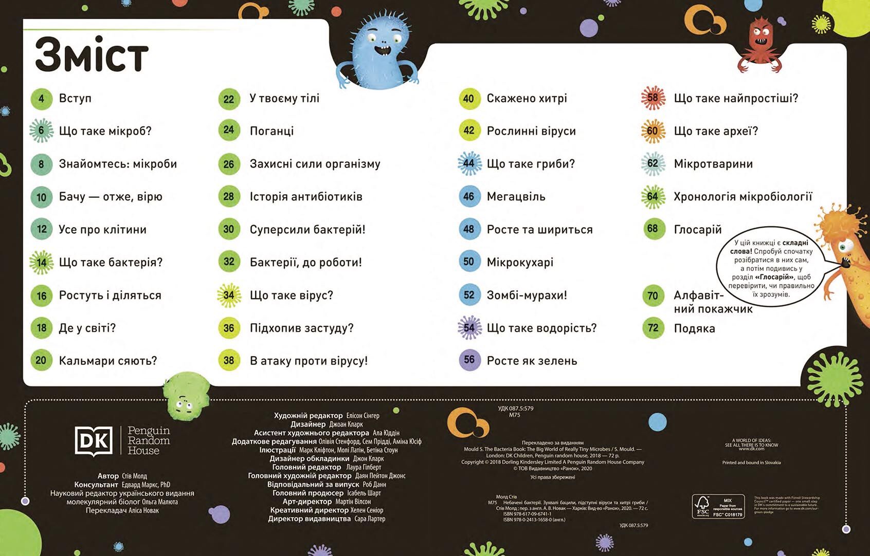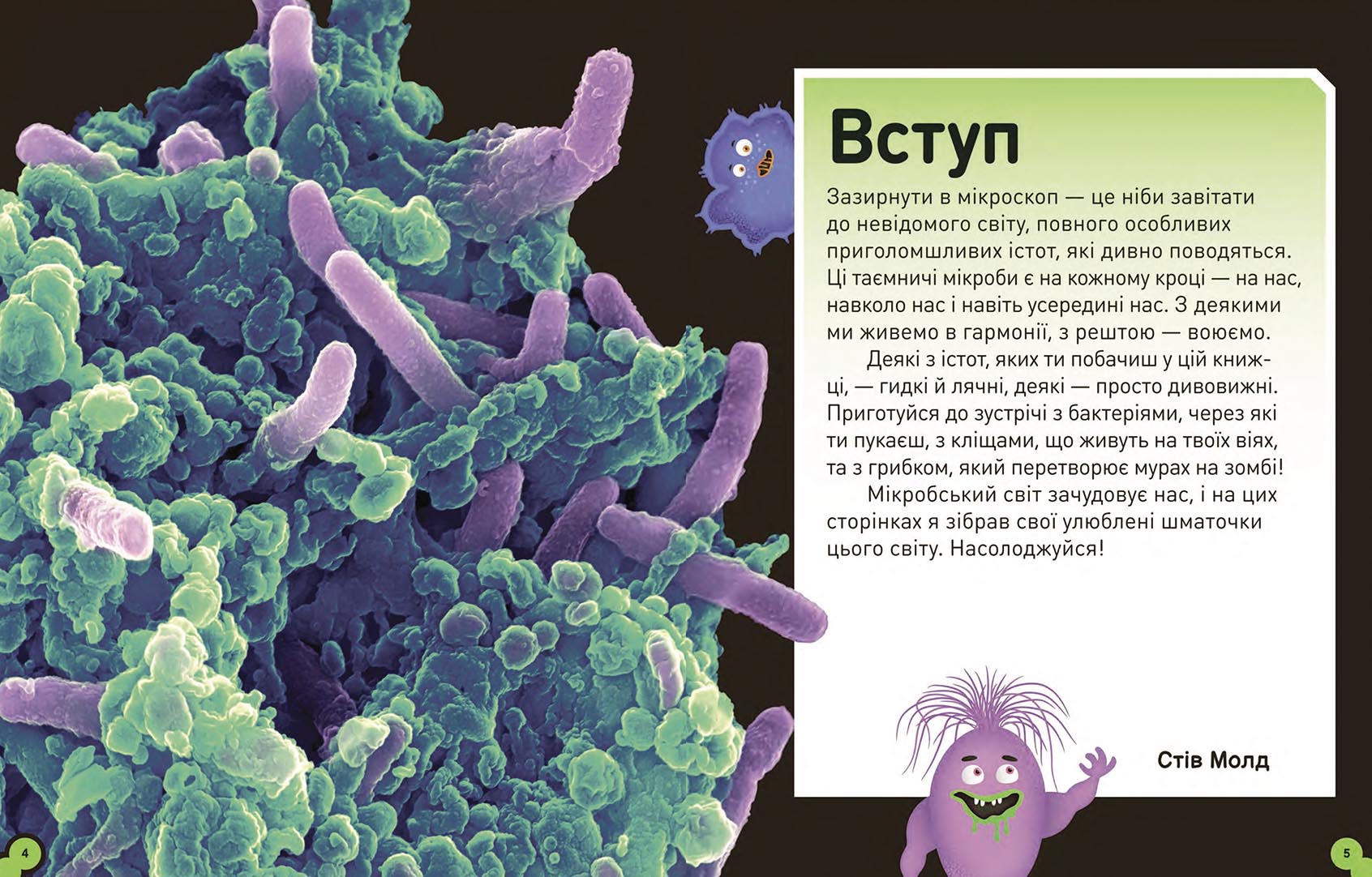 В книжці яскраво подано цікаві факти про мікроорганізми — бактерії, грибки, водорості, віруси і мікротварин, як-от тихоходи тощо. Також дуже наочно і дотепно розказано про основні етапи розвитку мікробіології і важливість цієї науки, а також про основи гігієни і здорового способу життя. Текст супроводжується веселими і дуже влучними ілюстраціями. Все це в комплексі робить книжку неймовірно цікавою і корисною для дітей, а також для їхніх батьків.