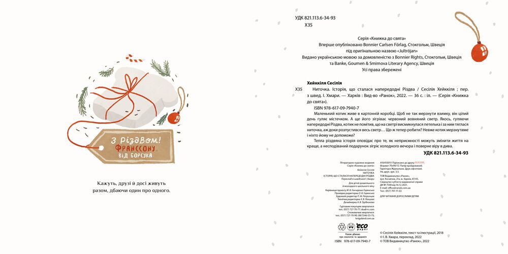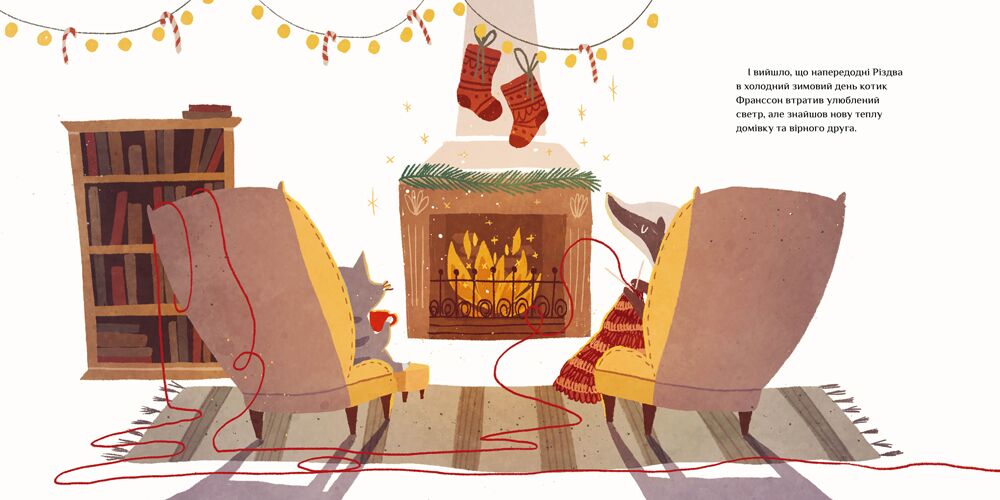 Маленький котик живе в картонній коробці. Щоб не так мерзнути взимку, він цілий день гуляє містечком. А ще його зігріває червоний вовняний светр. Якось, гуляючи напередодні Різдва, котик не помітив, що на светрі висмикнулася петелька і за ним тяглася ниточка, аж доки розпустився весь светр… Що ж тепер робити? Невже котик мерзнутиме і ніхто йому не допоможе?