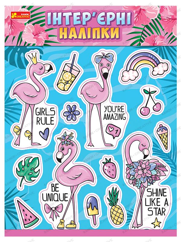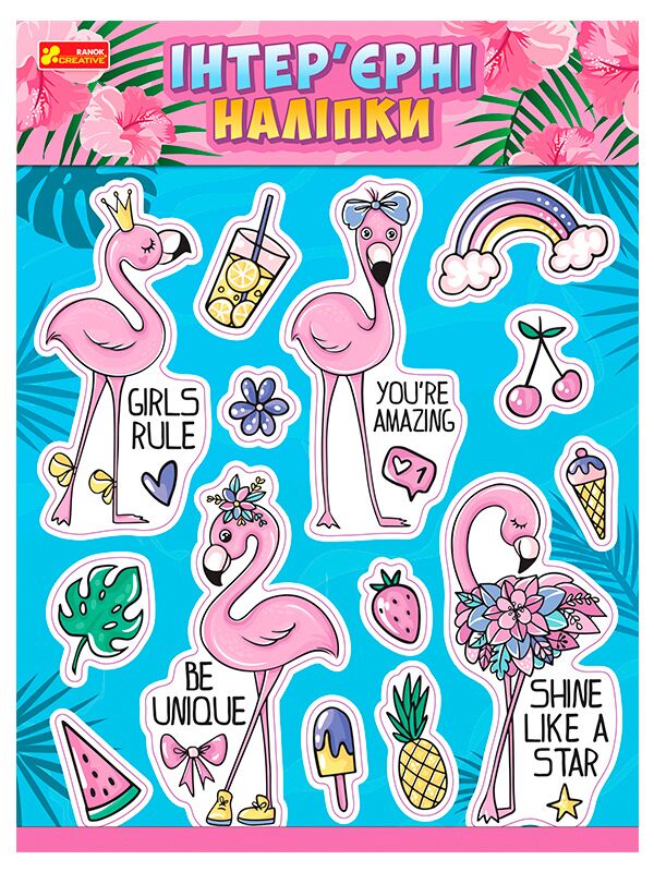 Інтер'єрні наліпки Фламінго Ранок. Стена в детской? словно экзотическая страна. Разноцветное мороженное, ананасы, коктейли и радуга! Сказочные жители страны фламинго гордо дополняют сюжет. Набор интерьерных наклеек для мечтательниц и принцесс. ?