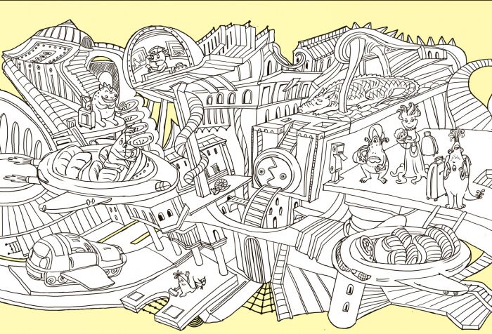 Під землею Розмальовка Булгакова Анна Ранок. Розмальовки серії «Довжеле-е-е-езна подорож» завдовжки 4,5 метри! Незвична форма сприяє тому, щоб з головою зануритися у творчий процес: від розфарбовування химерних будівель та дивакуватих мешканців не доведеться відволікатися на перегортання сторінок. Ретельно промальовані, деталізовані пейзажі фантастичних мегаполісів не тільки пробуджують уяву, а й гарантують те, що розмальовки вистачить надовго, навіть, якщо розфарбовувати її безперервно.