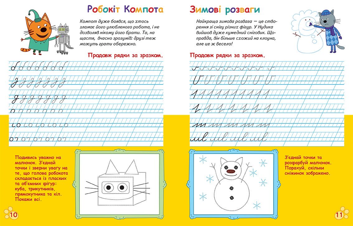 Кожна сторінка набору містить малюнок казкового персонажа Кота, що зацікавлює та надихає дітей на навчання. Крім того, на кожній сторінці є вправи для письма в лінійку, що допомагають розвивати правильний почерк та координацію рухів.