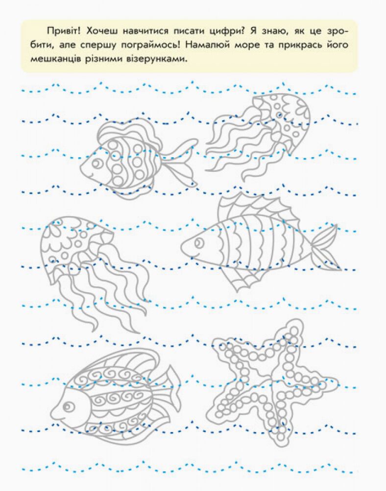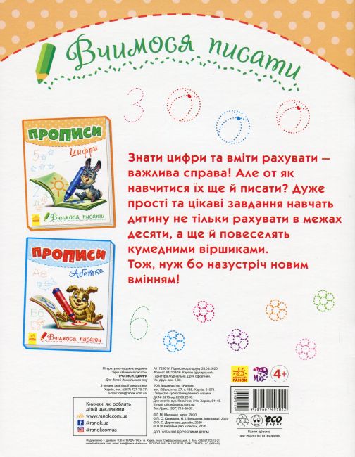 Книга ПРОПИСИ. ЦИФРИ. Вчимося писати містить не тільки вправи на написання цифр, але й інтересні завдання на використання їх у різних ситуаціях, що сприяє розвитку мислення та творчих здібностей дитини.