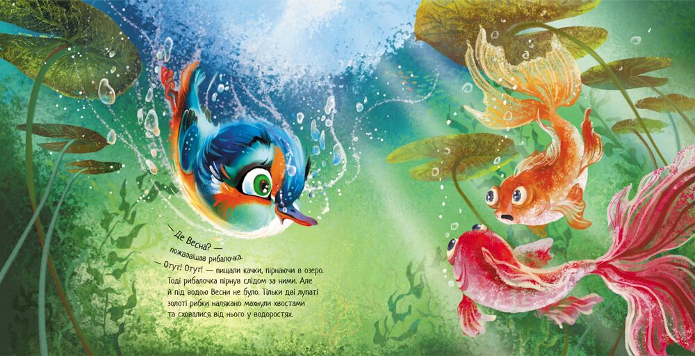 Птах-рибалочка і Весна Маленький птах-рибалочка не знав, хто така Весна, але дуже на неї чекав. Адже тільки з приходом Весни він зможе полетіти додому. І пташеня вирішило саме знайти й поквапити Весну. Де воно тільки її не шукало: і в небі, і в озері, і на горі,— але ніде не знаходило. Та Весна завжди приходить до того, хто її шукає.