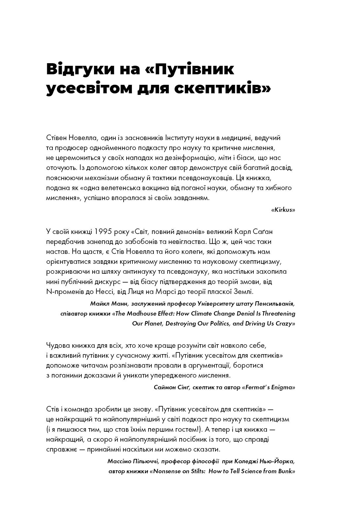 Світ довкола нас може лякати величезною кількістю дезінформації, мітами та забобонами. Тож «Путівник усесвітом для скептиків» точно стане нам у пригоді. Стівен Новелла — американський невролог, доцент Єльського університету, популяризатор науки, ведучий однойменного з книгою подкасту — ділиться ключовими засадами здорового скептицизму і пропонує своєрідну інструкцію для розвитку критичного мислення, без якого сучасній людині не обійтися.