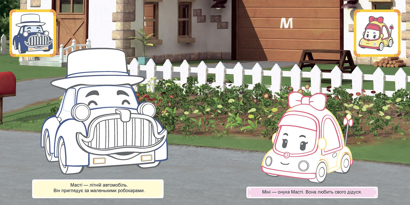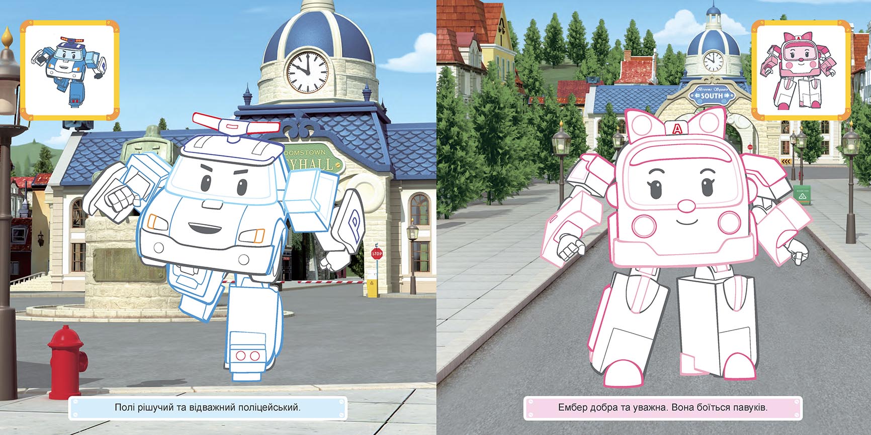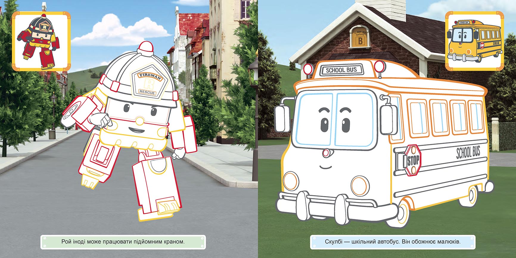 Розмальовки з героями мутсеріалу «Робокар Полі». Яскраві фонові ілюстрації та великі елементи для розфарбовування будуть цікаві навіть найменшим прихильникам машинок-трансформерів. На дванадцяти сторінках дитина зможе познайомитись з майже всіма героями мультфільму та розфарбувати їх як забажає або за кольоровим зразком, який розташовано у верхньому кутку сторінки.