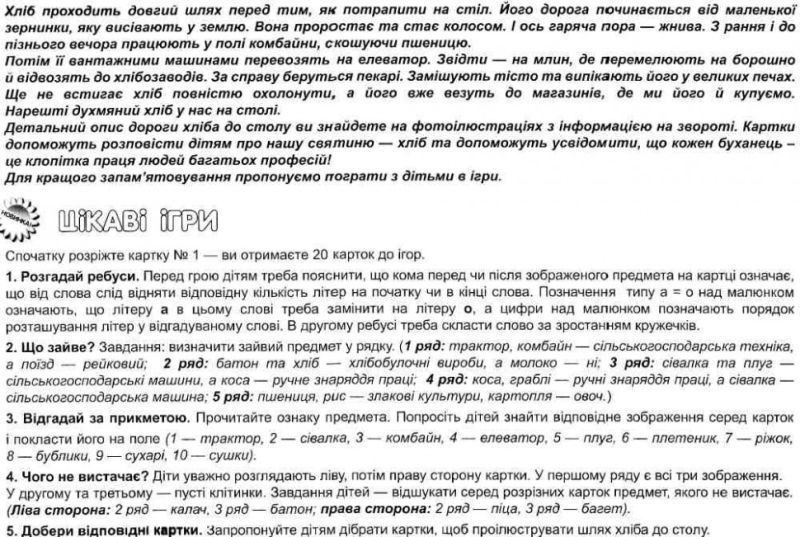 Кожна фотоілюстрація показує різні етапи виробництва хліба, від посіву зерна до випічки хліба. Це допомагає дітям зрозуміти, звідки походить їхній щоденний продукт та як він потрапляє на їхній стіл. Крім того, цей матеріал містить цікаві ігри, які стимулюють розвиток уяви та логічного мислення.